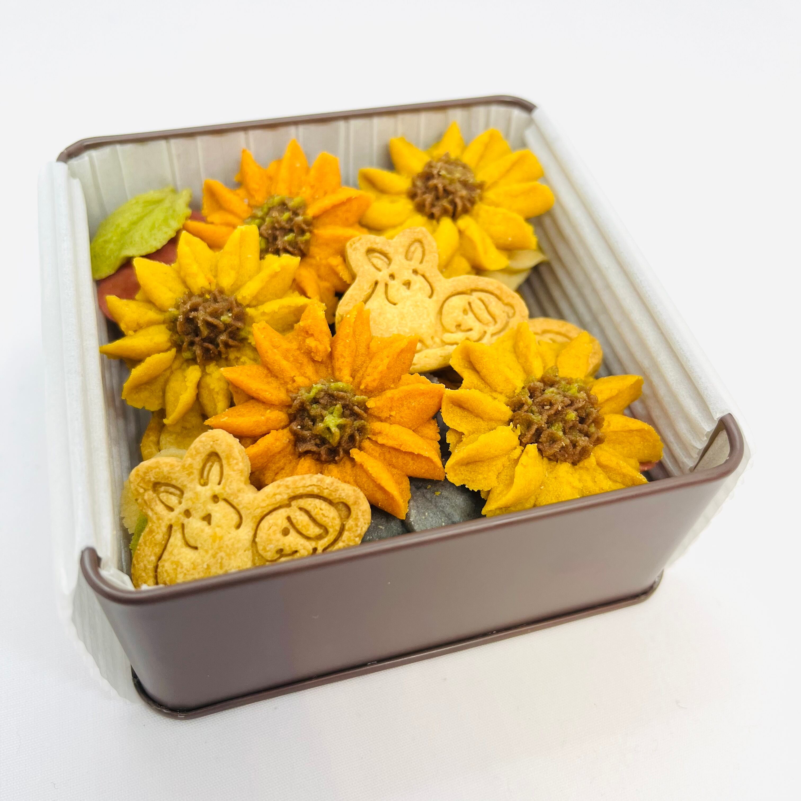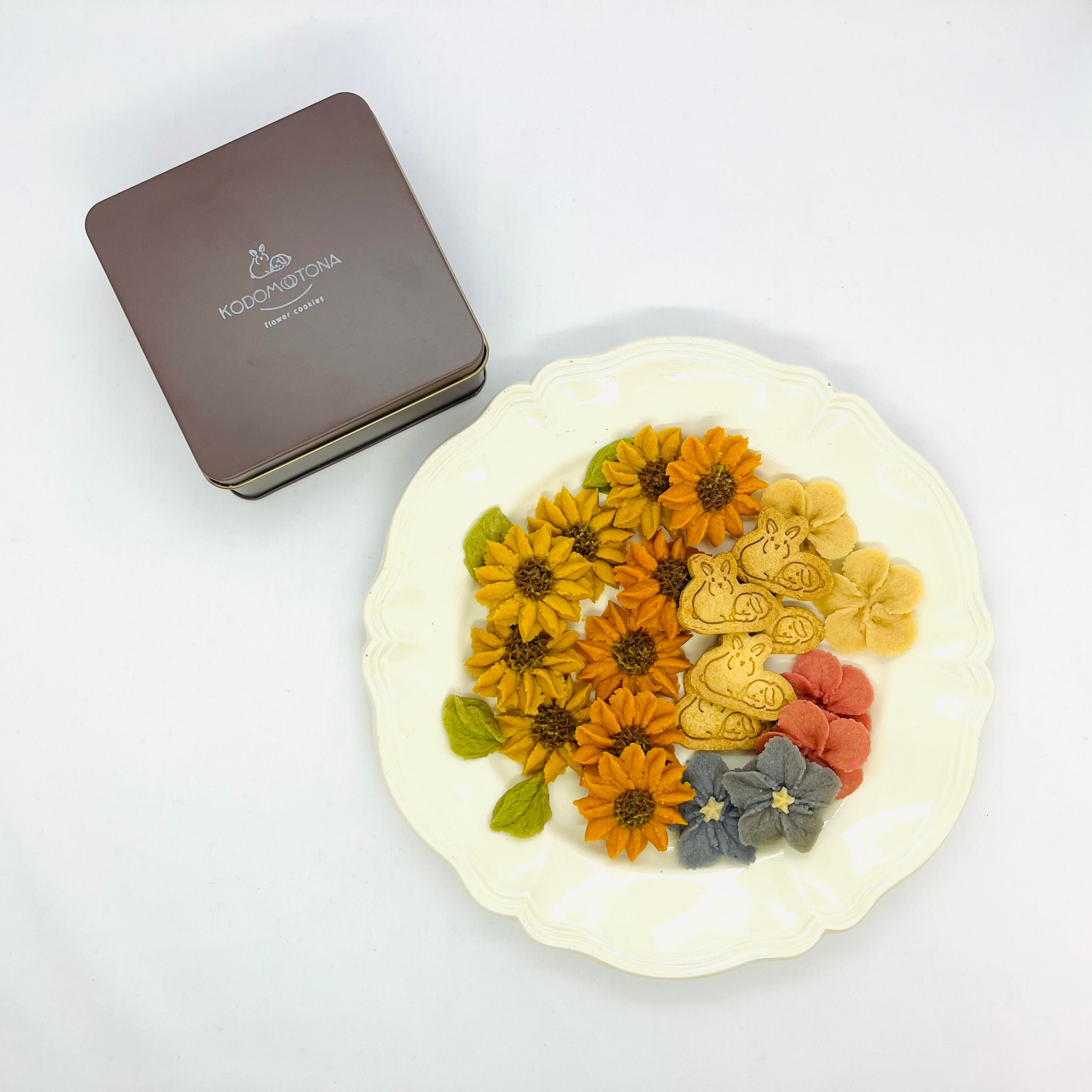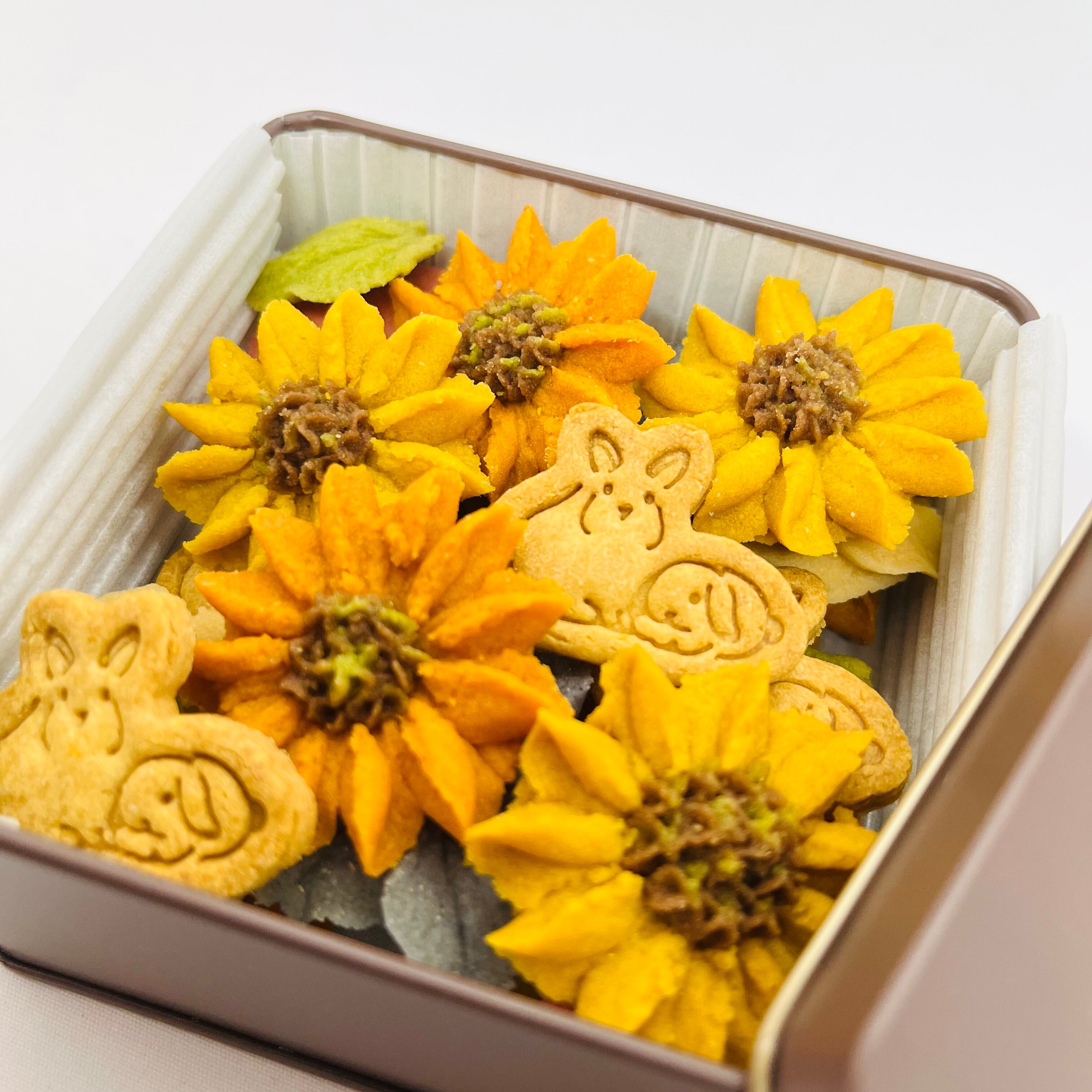 でも中身は豪華に、あんこのフラワークッキーで溢れています。ミニのうさぎロゴの米粉クッキーも顔を出して、可愛らしく仕上がりました。